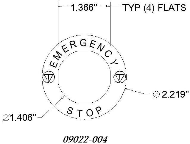 Rees; Legend Plate; Standard; Size: 22.500 MM X 1.366 IN Type (4) Flats; Legend: EMERGENCY STOP; Inside Diameter: 1.406 IN; Outside Diameter: 2.219 IN