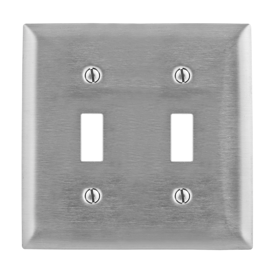 PREMISE WIRING Wallplate, Standard, 2 Gangs, 2 Ports, 4.5 in H x 4.6 in W, (2) Toggle Switch Cutout, Orientation: Horizontal/Vertical, Threaded, Stamped Construction, 0.035 in Thickness, 302/304 Stainless Steel, Metallic, Smooth Satin