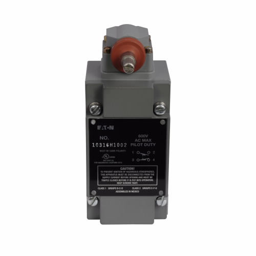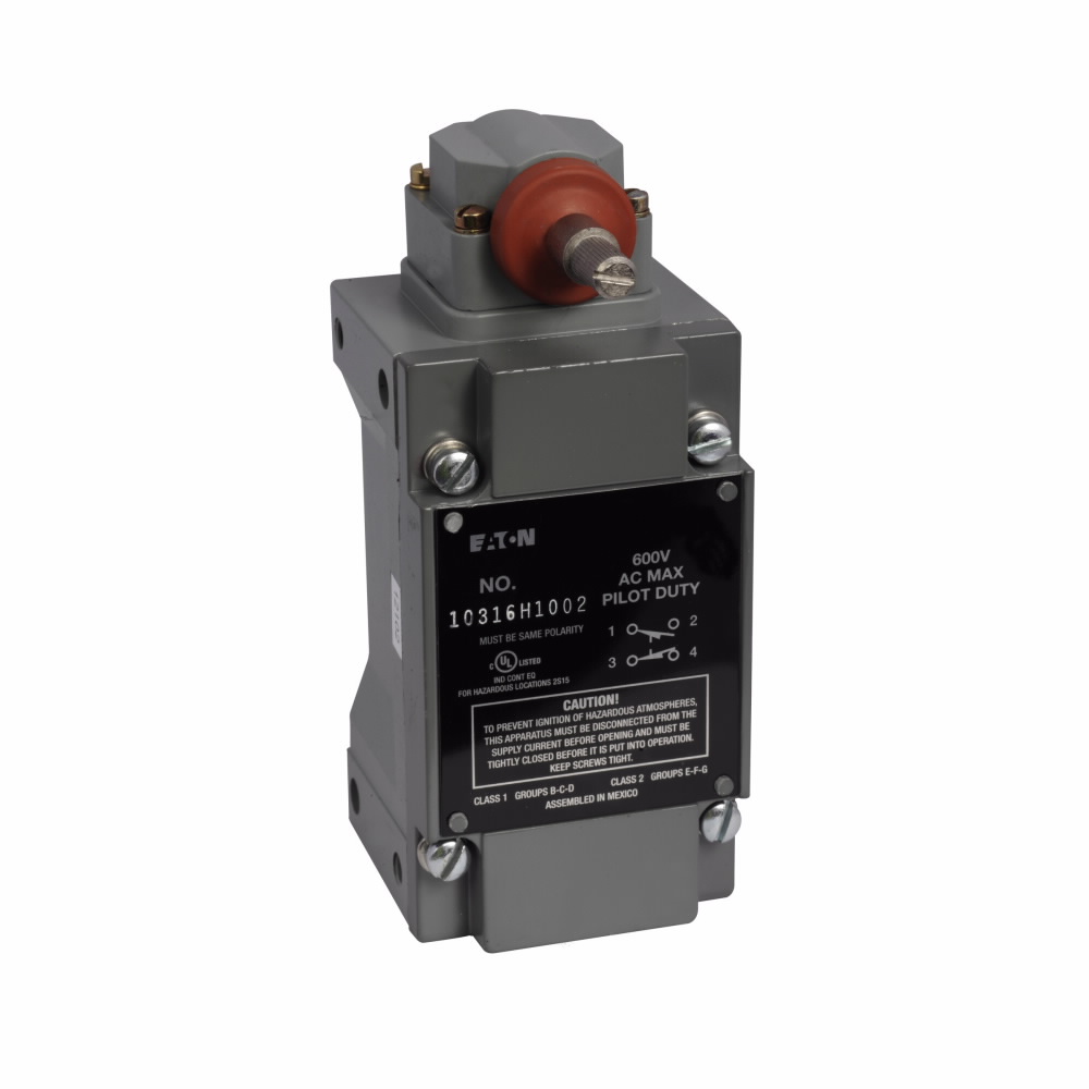 EATON Limit Switch, Type LX Complete Assembled, Series: 10316, 240 VAC, 250 VDC, 0.1/10 A, 1NO-1NC Contact Configuration, 10 A at 240 VAC, 0.1 A at 250 VAC Contact, 1 Pole, Spring Return/Standard Action, Side Rotary Actuator, Screw Connection, NEMA 7/9 Enclosure, Surface Mounting, 5.21 in L x 2.81 in W x 2.26 in H Size, -20 to 200 deg F Operating, Die Cast Aluminum