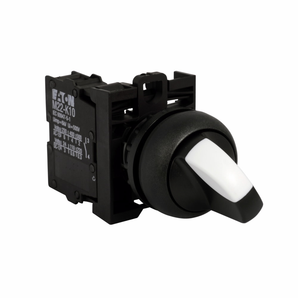 Eaton M22 selector switch line offers an almost endless variety of options in maintained/momentary, key removal and illuminated devices. The coding adapters used for maintained/momentary and key removal positions make the M22 stand out from competitive devices. By simply adding or removing a coding adapter from inside the operator, the end user can change the function of the button. Operator options include standard knob, rotary head, illuminated and keyed versions. As with all operators, they can be ordered as a ready to install complete device or as modular components to meet application specific requirements.