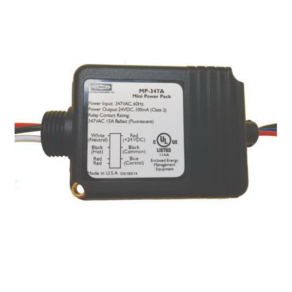 Hubbell Control Solutions Power Pack, Plenum Rated, 347 VAC Input, 24 VDC Output, 60 Hz, 100 mA, 15 A at 347 VAC Relay Rating, 32 to 104 deg F Operating, 0 to 95% Non-Condensing Humidity, 2.33 in Width, 1.36 in D, 3.69 in Height, Plastic, Black
