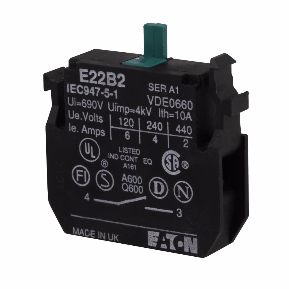EATON Contact Block, Heavy Duty Non-Metallic Standard, Series: E22, 22.5 mm, 1NO, 10 A at 600 VAC, 2.5 A at 600 VDC Contact, Silver Contact, Screw Terminal, Front Mount, 1-1/2 in L x 1-1/2 in W x 1/2 in H
