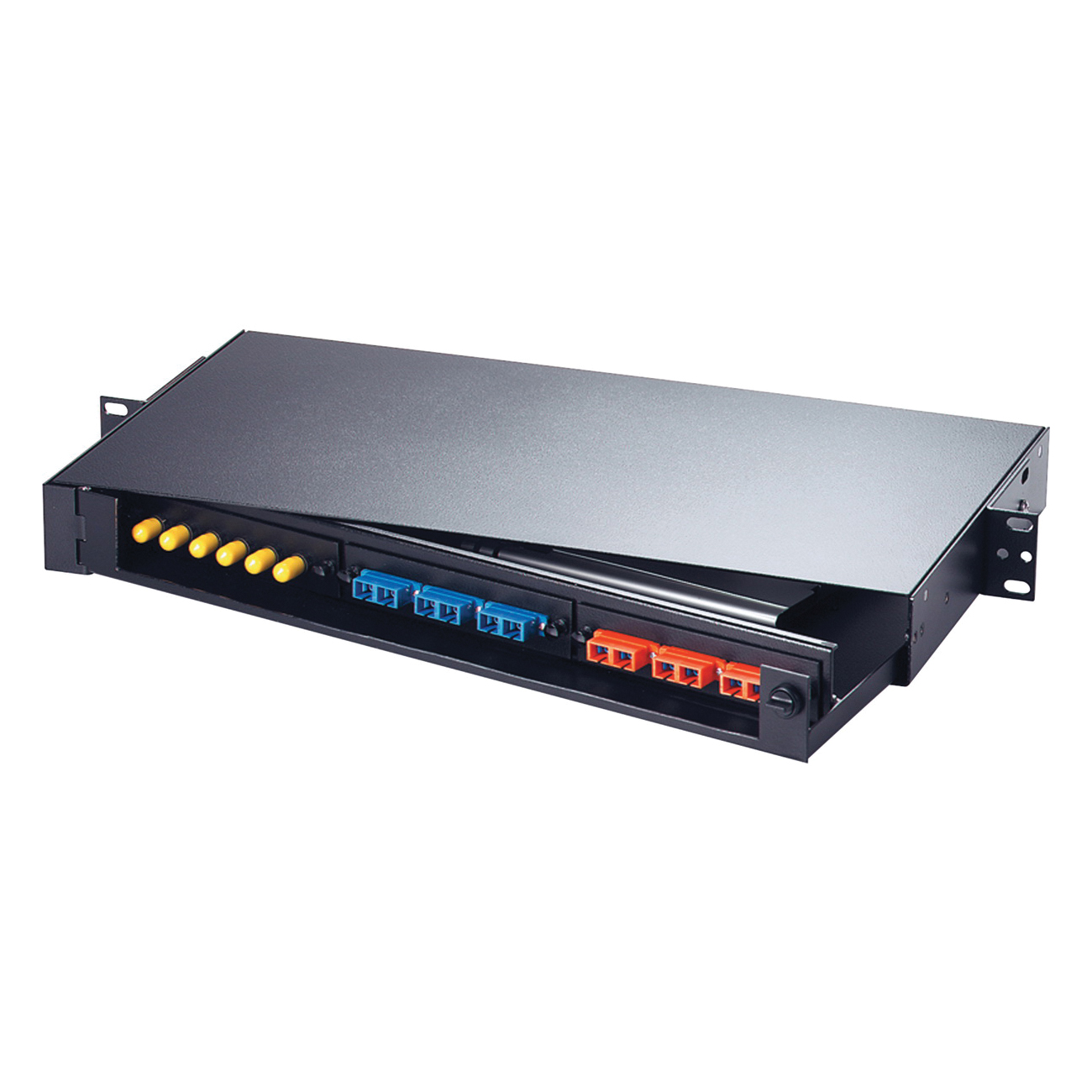 Hubbell® FPR3SP fiber optic interconnection shelf is an economical and efficient way to organize and protect fiber connections and splice trays in rack mount fiber optic applications. This shelf is especially useful in situations where a high density of patch cord terminations is required. The shelf is designed to fit in a single rackspace (1U) and accepts three snap-in six pack adapter panels for a standard port capacity of 18 fiber connections. The six pack adapter panels are recessed horizontally in the hinged swing out tray for superior patch cord protection. Snapping in Hubbell® high density six pack adapter panels provide a total port capacity of 24 ST or 36 SC ports.