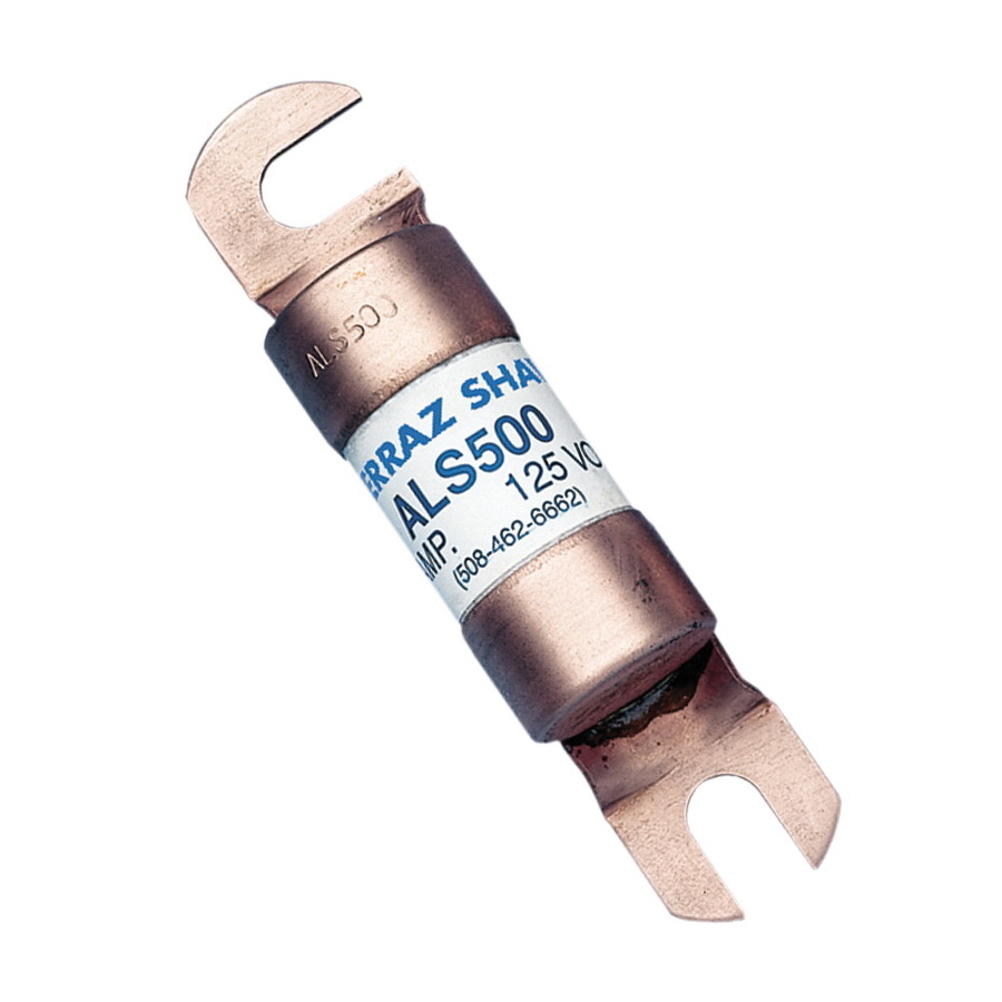 Ferraz Shawmut Special Purpose Fuse, General Purpose, Series: ALS, Non-Indicating, Non-Rejection, 500 A, 125 VAC/VDC, 10 kA Interrupt, Time Delay, Blade Terminal, Bolt-On Mount, Ferrule Body, Dual Element, 4.71 in Length, 1.12 in Width, Poly Tube