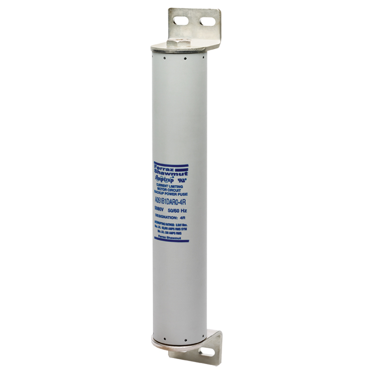 Mersen r-rated fuses are current limiting, high interrupting rating fuses intended for the short circuit protection of medium voltage motors and motor controllers. R-rated fuses are back-up fuses that have a minimum interrupting rating and must be coordinated with overload relays in combination motor starters. The motor starter manufacturer generally specifies the r-rated fuse size. These fuses are single, double, triple or quadruple barrels 3 in diameter with end mounts designed for bolting directly to equipment bus or terminal pads.